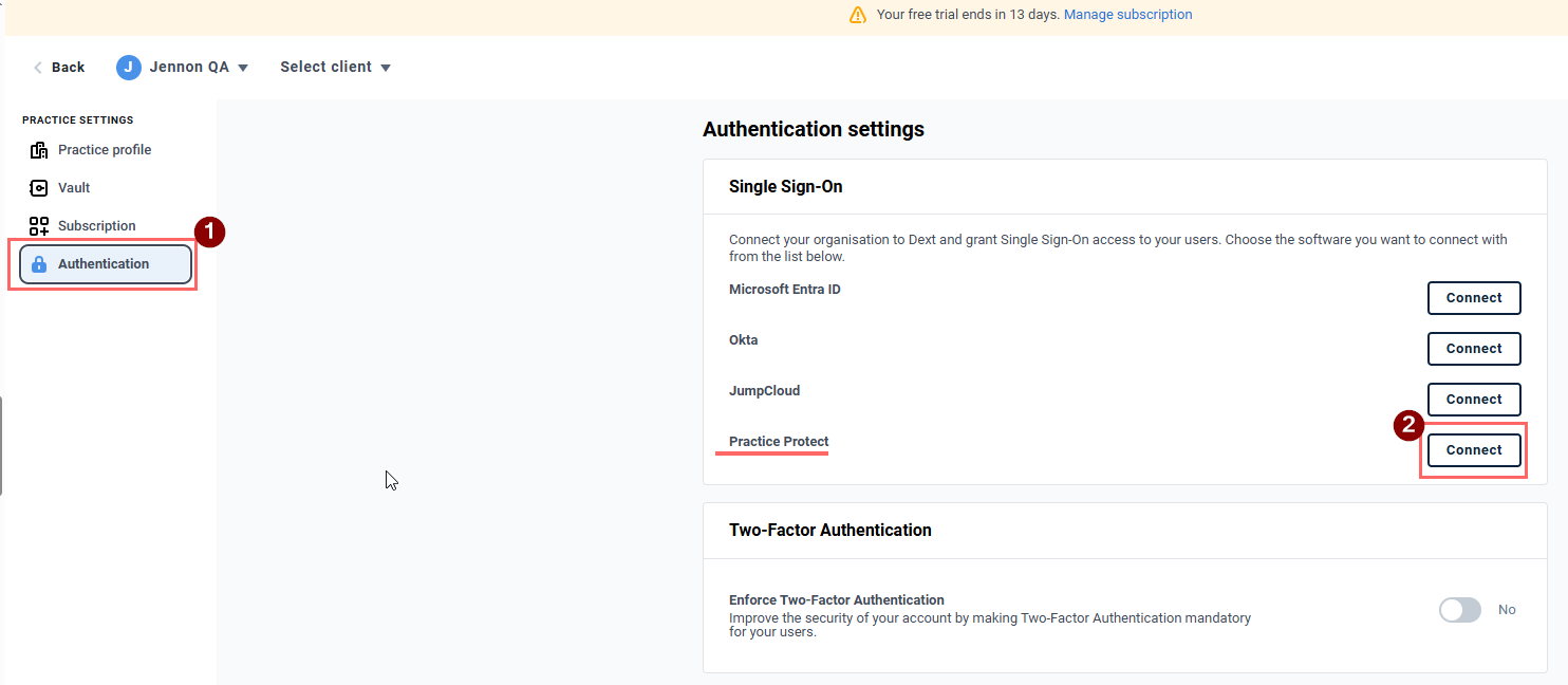 14. Under Authentication Settings for Single Sign-On, click Connect next to Practice Protect.