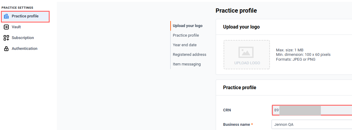12. Go to Practice Profile, copy the CRN and save it as this will be used in a later step.