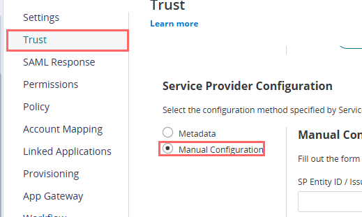 19. Go to the Trust page, navigate to Service Provider Configuration, and select Manual Configuration.