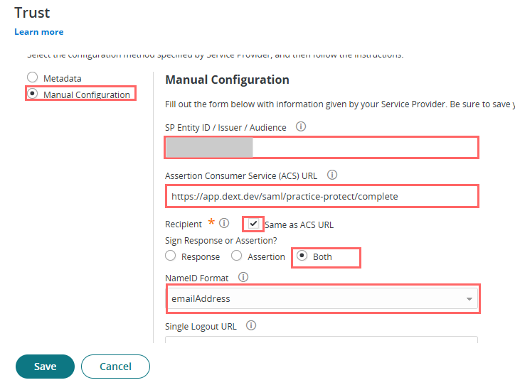2. Assertion Consumer Service (ACS) URL – Copy and Paste this URL https://app.dext.com/saml/practice-protect/complete