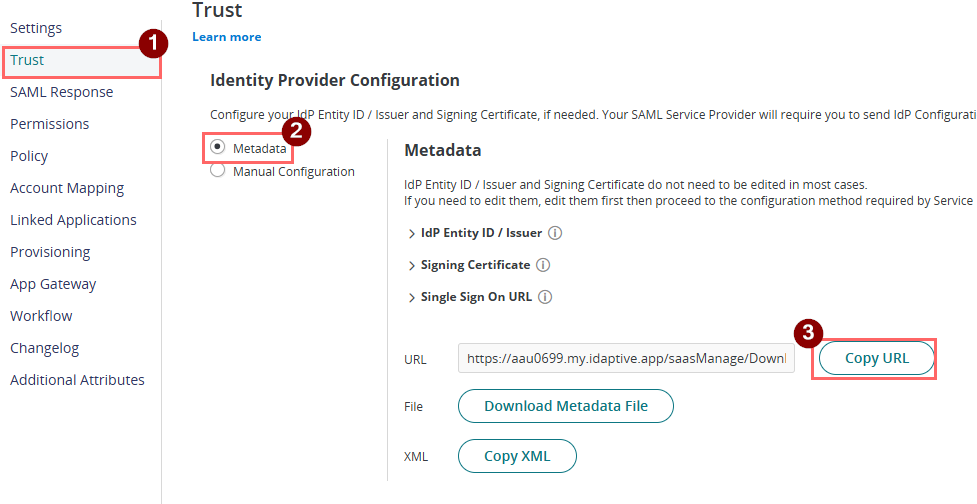 8. Go to the Trust page under Identity Provider Configuration and select Metadata. Click Copy URL to copy the Metadata URL, and save this as it will be used in a later step.