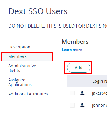 3. Within the created role, click on Members Add. Add each user that should have access to the Dext application, then Save.